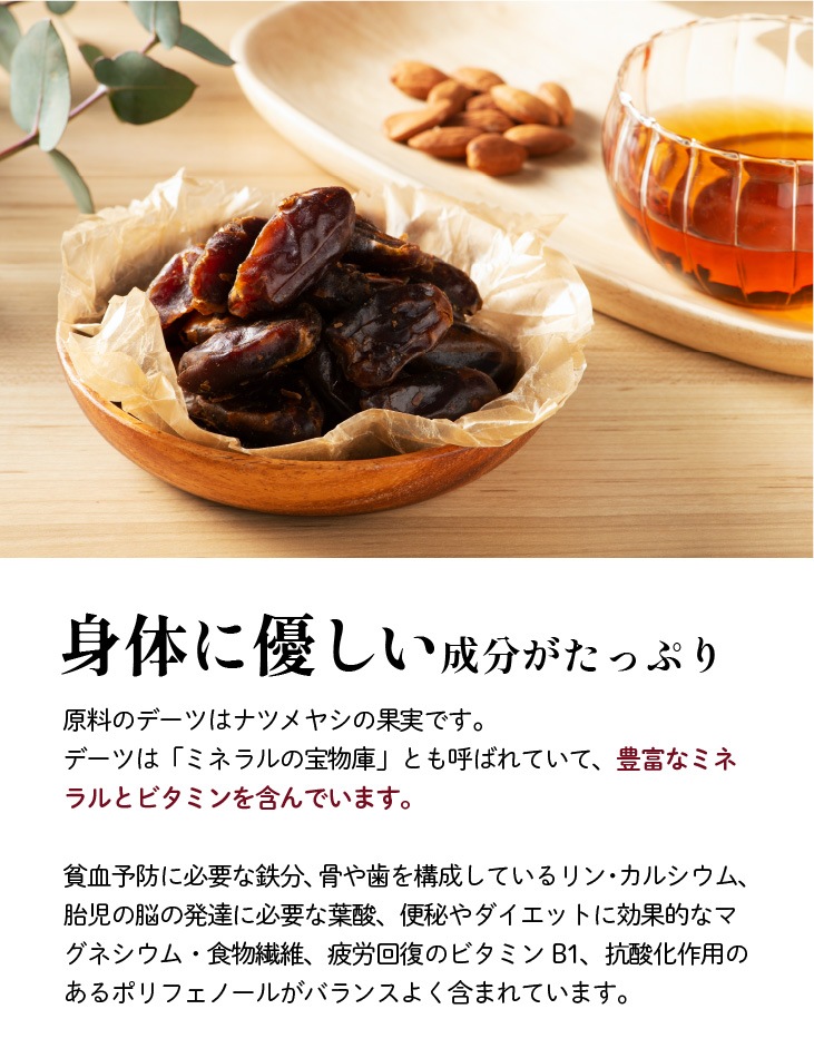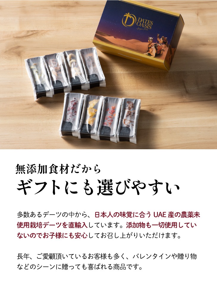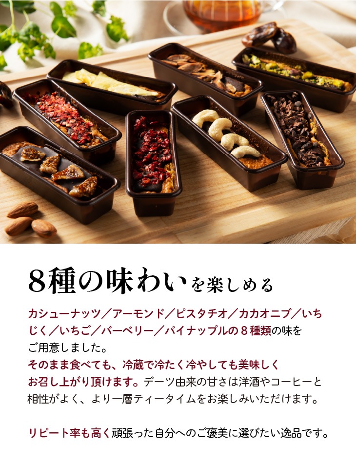 カシューナッツ/アーモンド/ピスタチオ/カカオニブ/いちじく/いちご/バーベリー/パイナップルの8種類の味をご用意しました。 そのまま食べても、冷蔵で冷たく冷やしても美味しくお召し上がり頂けます。デーツ由来の甘さは洋酒やコーヒーと相性がよく、より一層ティータイムをお楽しみいただけます。 リピート率も高く頑張った自分へのご褒美に選びたい逸品です。 ホワイトデー限定仕様として気持ちを伝える"選べる"オリジナルホワイトデーカードを添えてお届けします。 |