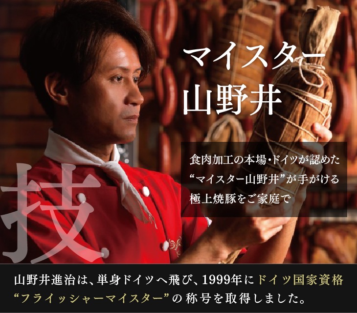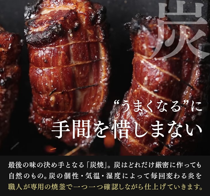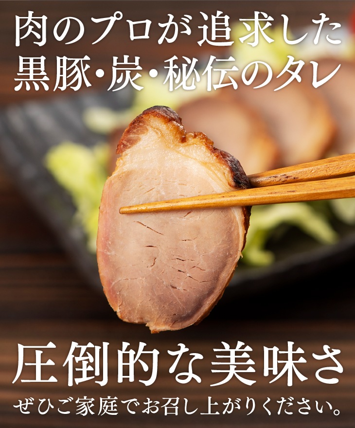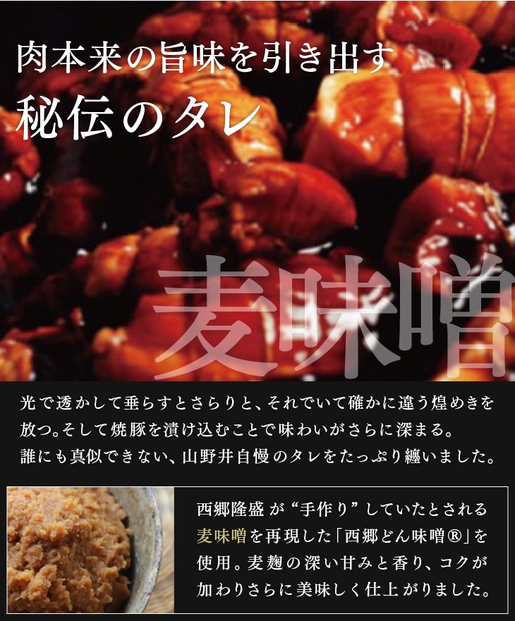 | 黒豚モモ肉を薩摩の偉人 西郷隆盛も食べていたといわれる、明治時代の薩摩自家製味噌を再現した麦麹たっぷりの「西郷どん味噌®」。「西郷どん味噌®」を山野井秘伝の焼豚タレに使用し、麦麹薫る深みと甘みを引き出し、炭焼きにて香ばしく焼き上げた、香りと甘みの強さが引き立った炭焼き黒豚麦味噌焼豚です。 |