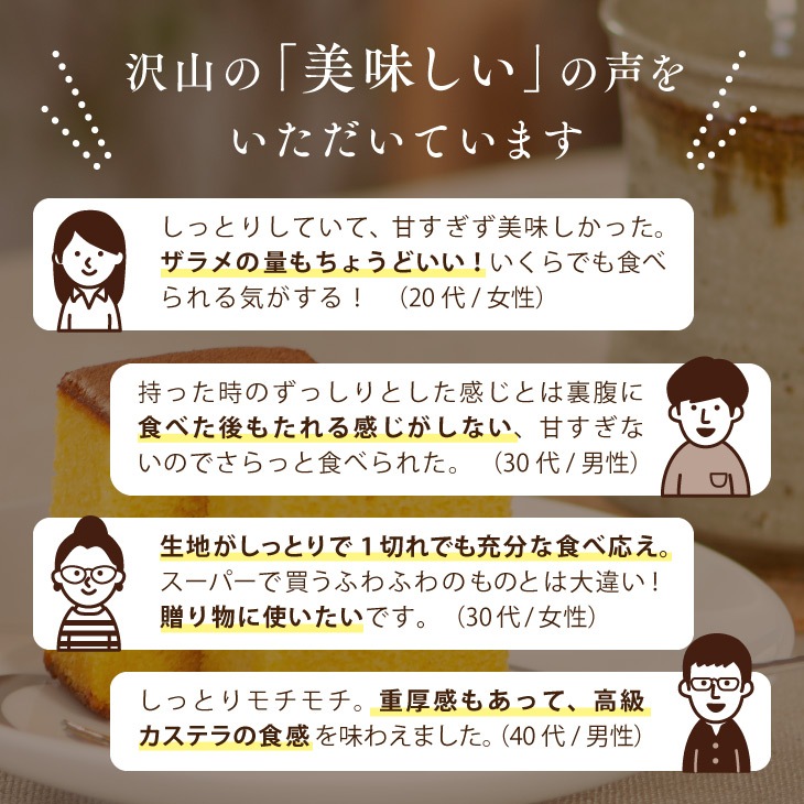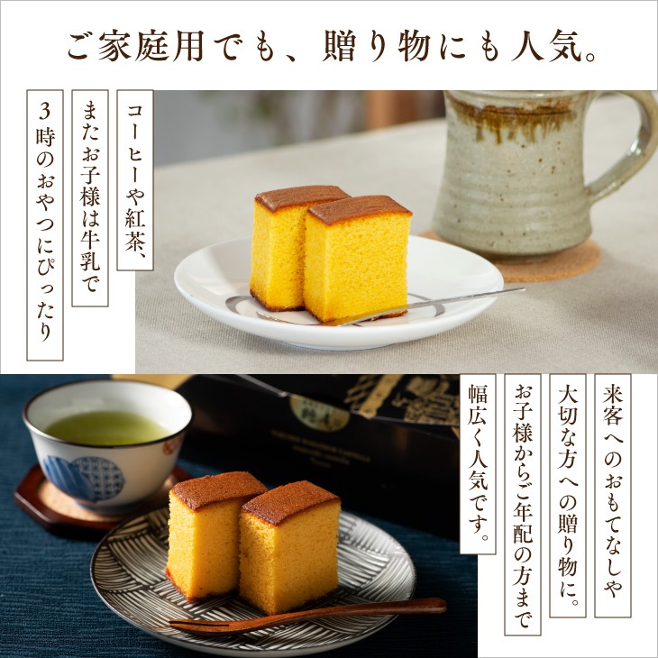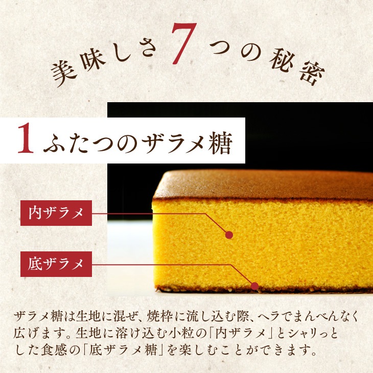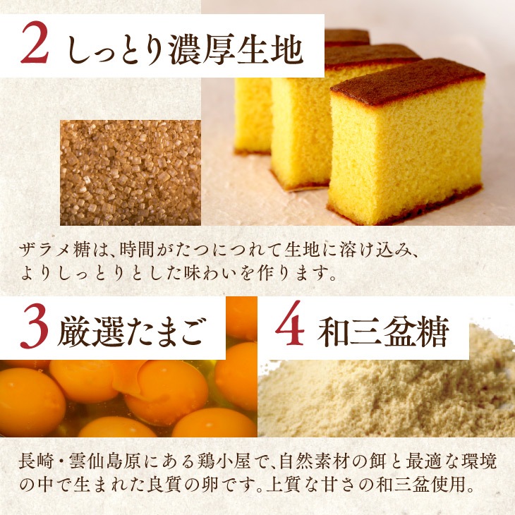 | 創業当時よりつづく、生地づくりから焼き上げまでを一人の職人が行い、今でも「手焼きカステラの専門店」として受け継がれた技を継承しております。 長崎カステラ糖庵の特徴でもある「底ザラメ糖」に加え、特別に「和三盆糖」「五三焼き専用卵」を使用しております。通常のカステラより深い味わいに焼き上げました。 人気の和三盆カステラ0.5号サイズを2本セットにしました。 ※ザラメ糖の食感を楽しみたい方は、お早めにお召し上がりください。特に夏の気温が高い時期には、溶けやすくなっております。ご了承ください。 |