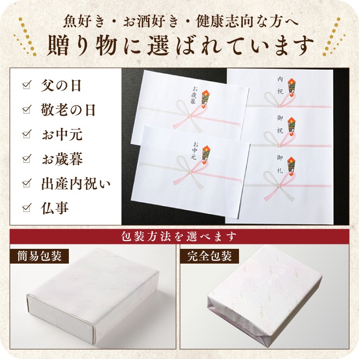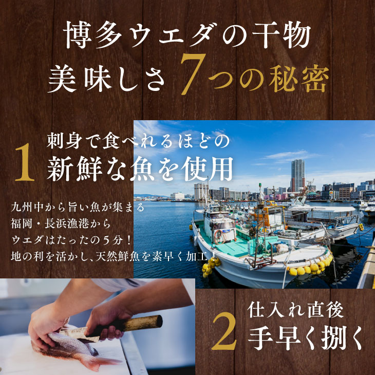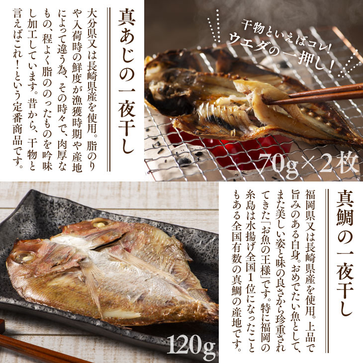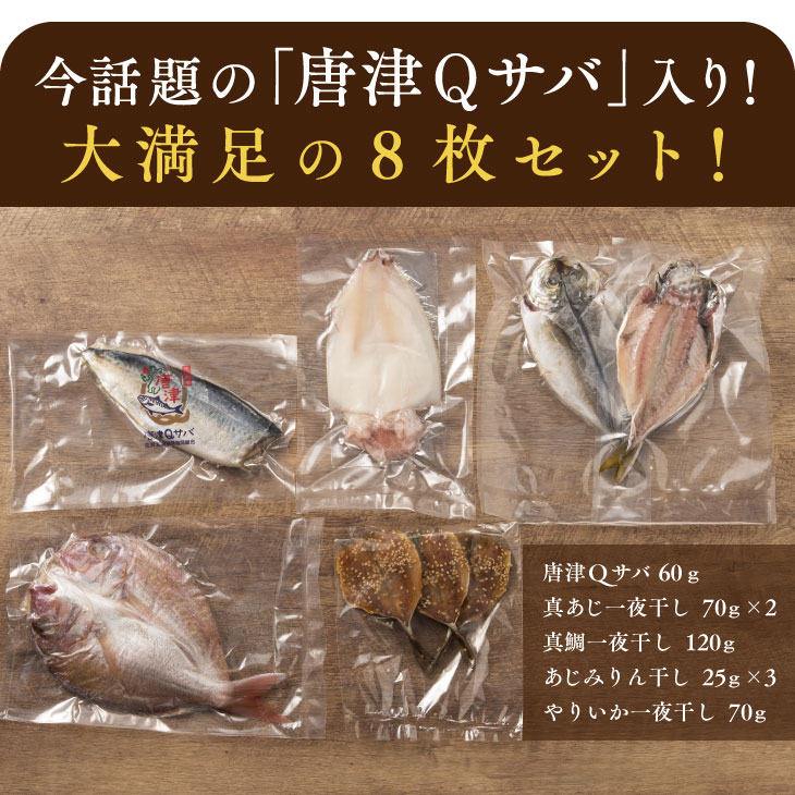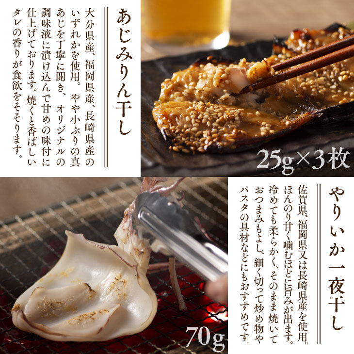 ・唐津Qサバ三枚おろし 60g ・真あじの一夜干し 70g×2 ・真鯛の一夜干し 120g ・あじみりん干し 25g×3 ・やりいかの一夜干し 70g |