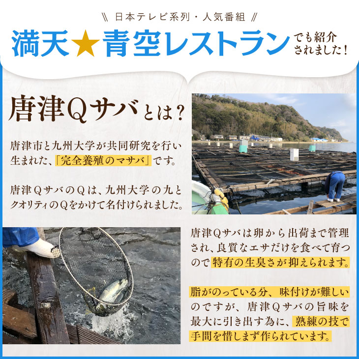 「唐津Qサバ」は完全養殖のマサバで、一年を通じて脂ののりが安定。天然のサバだと脂質平均含有量が10%に対して、この唐津Qサバは20%前後。寄生虫のアニサキスの心配もほぼないそうです。敬老の日や親御さんの誕生日プレゼントなどの贈り物にも良いですね。