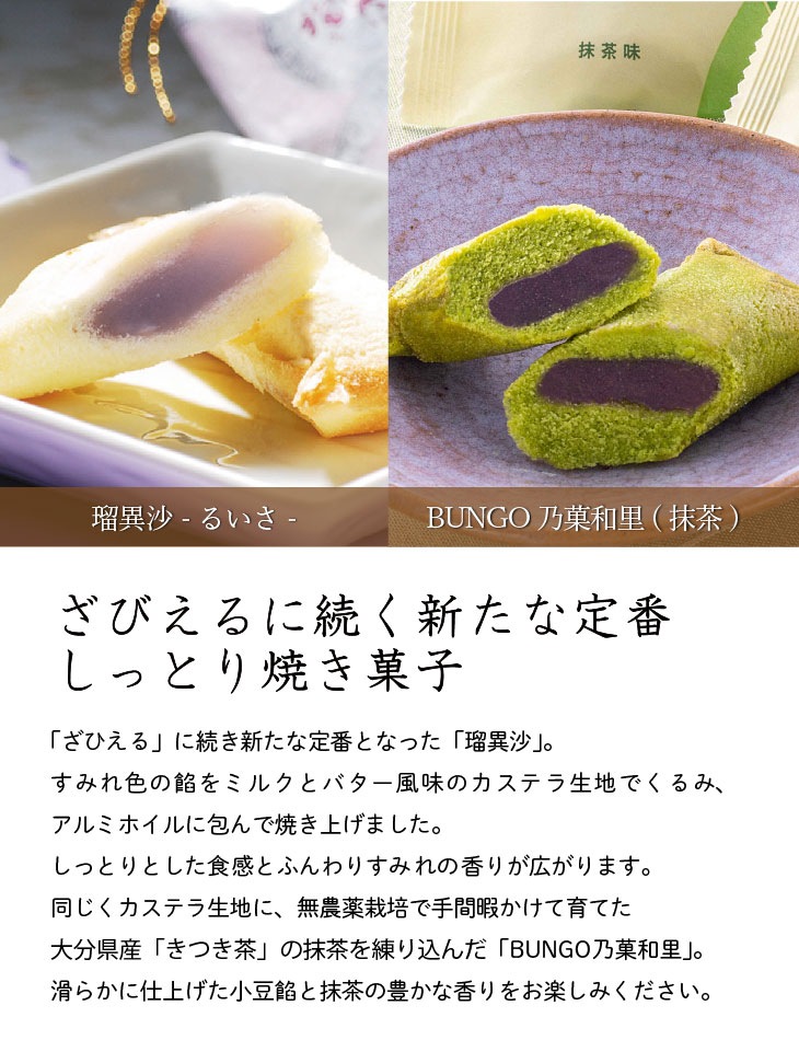 <ざびえる(銀)> 白餡(国内製造)、糖類(グラニュー糖・上白糖・麦芽糖)、小麦粉、還元水飴、マーガリン、 鶏卵、ショートニング、脱脂粉乳、コーンスターチ、寒天/甘味料(トレハロース)、香料、膨張剤、 (一部に小麦・卵・乳成分・大豆を含む) <ざびえる(金)> 原材料名:白餡(国内製造)、糖類(グラニュー糖・上白糖・麦芽糖)、小麦粉、還元水飴、マーガリン、 鶏卵、ラム酒漬け刻みレーズン、ショートニング、脱脂粉乳、コーンスターチ、寒天/甘味料(トレハロース)、香料、膨張剤、 (一部に小麦・卵・乳成分・大豆を含む) <瑠異沙> 白餡(国内製造)、糖類(上白糖・グラニュー糖)、小麦粉、鶏卵、ショートニング、還元水飴、マーガリン、 リキュール、寒天/甘味料(トレハロース)、酒精、香料、着色料(カルミン酸・クチナシ)、(一部に小麦・卵・乳成分・大豆を含む) <BUNGO乃菓和里(抹茶)> 砂糖(上白糖(国内製造)・中双糖・麦芽糖)、赤餡、小麦粉、鶏卵、ショートニング、還元水飴、マーガリン、リキュール、抹茶加工品(デキストリン・抹茶)、抹茶、寒天/甘味料(トレハロース)、乳化剤、香料、着色料(カラメル・クチナシ)、酸化防止剤(ビタミンC)、(一部に小麦・卵・乳成分・大豆を含む) <豊のたちばな> 糖類(グラニュー糖(国内製造)・麦芽糖)、還元水飴、手亡飴、餅粉、餅米、カボス果皮、カボス果汁、 乳等を主要原料とする食品、リキュール、寒天、食塩/甘味料(トレハロース)、乳化剤、香料、(一部に卵・乳成分・大豆を含む) |