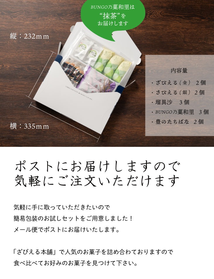 ・ざびえる(銀) 2個 ・ざびえる(金) 2個 ・瑠異沙 3個 ・BUNGO乃菓和里(抹茶) 3個 ・豊のたちばな 2個 |