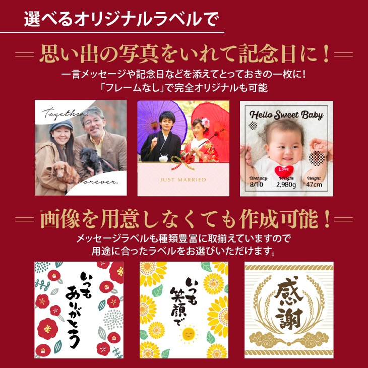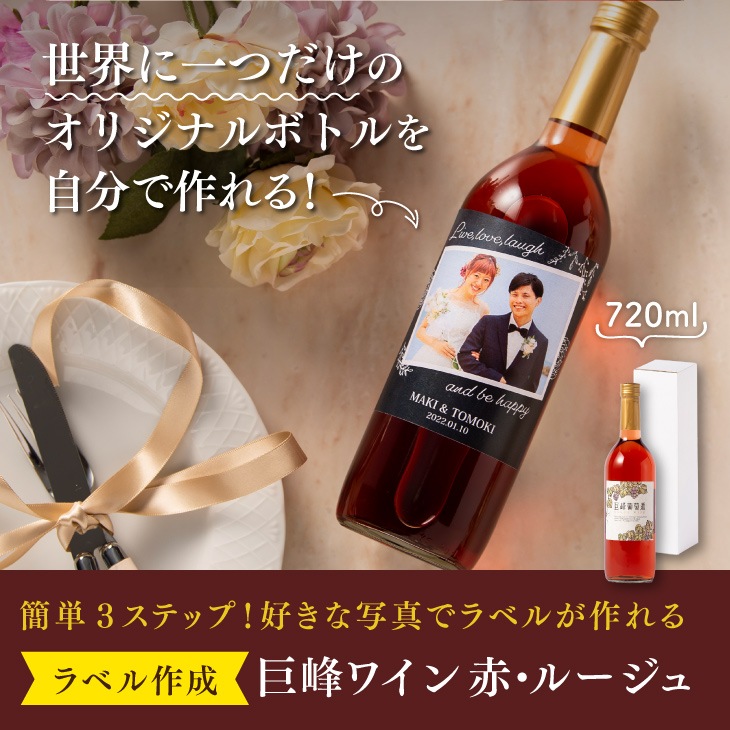 | 葡萄の王様『巨峰』で造ったワイン。ルージュは渋み、酸味がやさしい赤ワインです。懐石料理や和食、刺身の味を十分に生かせるワインです。 オリジナルラベル仕様なので好きな写真とメッセージを添えて世界に一つだけの特別な贈り物がお手持ちのスマホで簡単に作れます。お祝い事やイベントに大活躍!特別な日は記憶に残るオリジナルラベルでお祝いしませんか? 思わず笑顔になる特別なプレゼントできっと喜ばれる事間違いなし! |