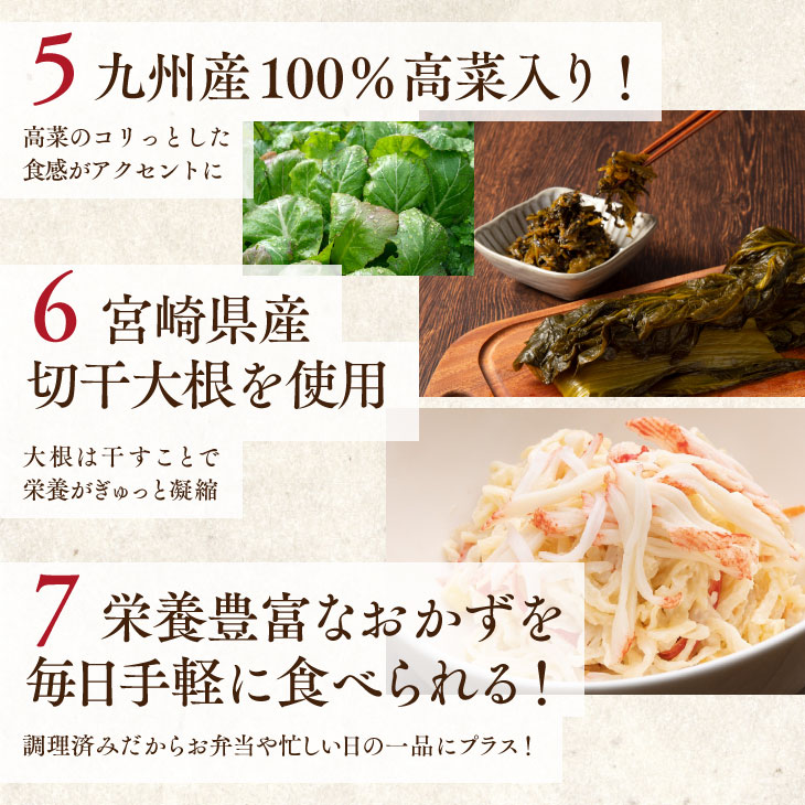 「簡単♪アジアの食卓」シリーズはそのままご飯に乗せたり、パスタ・トースト・チャーハンの具材などにも使える、九州産高菜100%使用したお惣菜です。 この商品の主原料である「大豆ミート」は、お肉のような食感で、不足しがちな植物性たんぱく質を手軽に摂取できるだけでなく、低カロリー・低脂肪であり、健康志向の方やダイエット中の方はもちろんのこと、お子様からご年配の方まで、安心してお召し上がりいただけます。ラインナップは「キーマカレー風味」「タコライス風味」「ガパオライス風味」の3種類がございます。 また、宮崎県産・切干大根サラダもお選び頂けます。こちらは、干すことで生の大根より栄養価が高く、食物繊維、カルシウム・鉄分が多く含まれる「きりぼし大根」をマヨネーズ風味のサラダに仕上げました。安心の宮崎県産原料で、おかずの一品として、カニカマやサラダチキン・ツナ等と和えるとより美味しくお召し上がり頂けます。お弁当にも最適です。 |