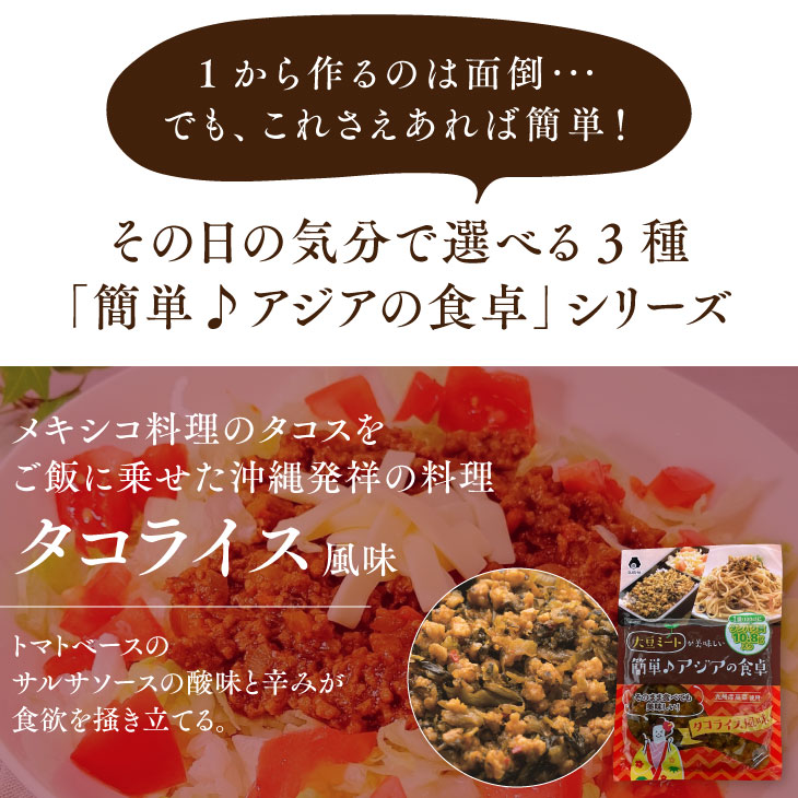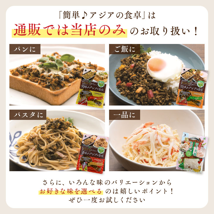 * 本商品には以下の展開がございます。 ・「簡単♪アジアの食卓」大豆ミートプラス切り干し大根サラダから選べる2種 |