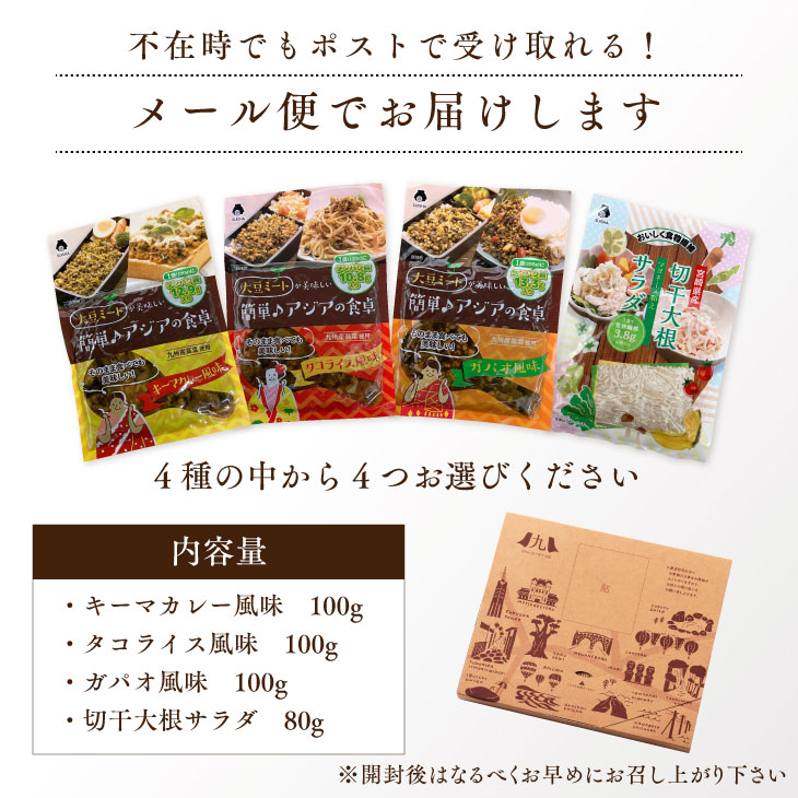 産地直送 「アジア風大豆ミートと切り干し大根サラダ 選べる4種」 九州 お取り寄せ 惣菜 健康 美容 大豆ミート タコライス キーマ ガパオ お弁当 お得 お試し 送料無料