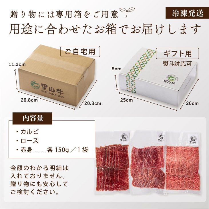 焼肉用(ロース、カルビ、赤身)各150g×1 計450g |