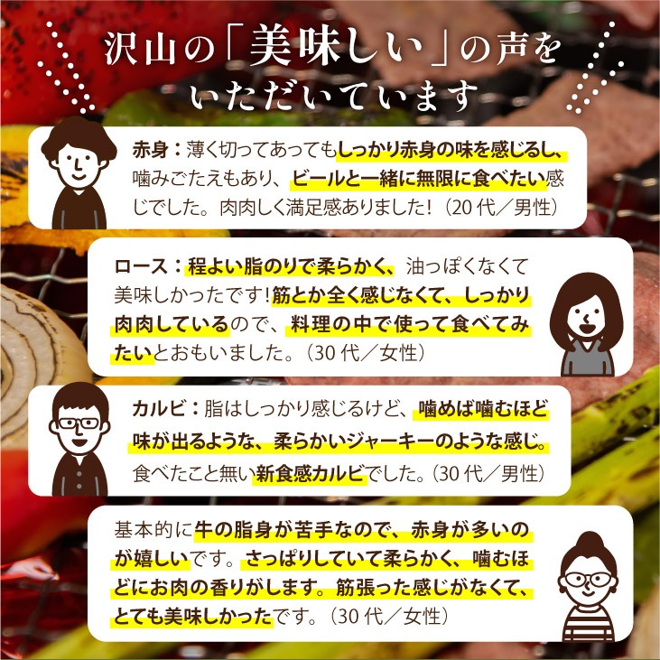 ■焼肉用ローススライス 畜種:黒毛和牛 原産地:鹿児島県・宮崎県・その他 部位:ロース ■焼肉用カルビスライス 畜種:黒毛和牛 原産地:鹿児島県・宮崎県・その他 部位:バラ ■焼肉用赤身肉スライス 畜種:黒毛和牛 原産地:鹿児島県・宮崎県・その他 部位:モモ |