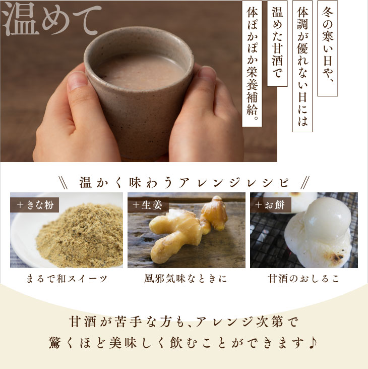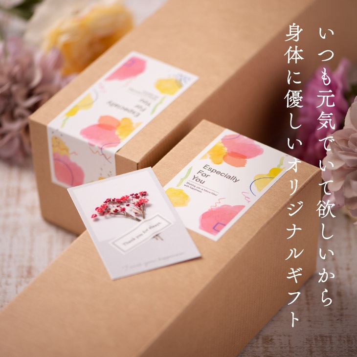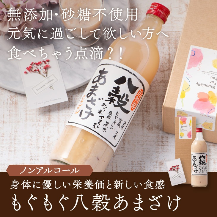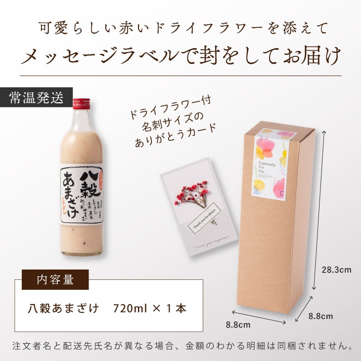 体に良いと言われる玄米をはじめ、黒米や赤米と言った古代米など八種類の穀物を存分に使用した八穀あまざけ。砂糖や添加物など一切使わずに、原料から出来る最高の甘さを醸しています。米と米麹を発酵させた本格製法のあまざけは天然のビタミン類やアミノ酸、ブドウ糖が豊富で滋養回復に良く「飲む点滴」と言われています。 ギフト限定仕様として、ドライフラワー付きカードを添えてお届けします。 |