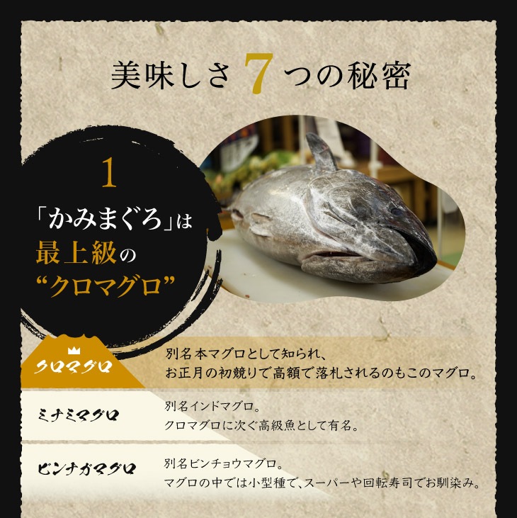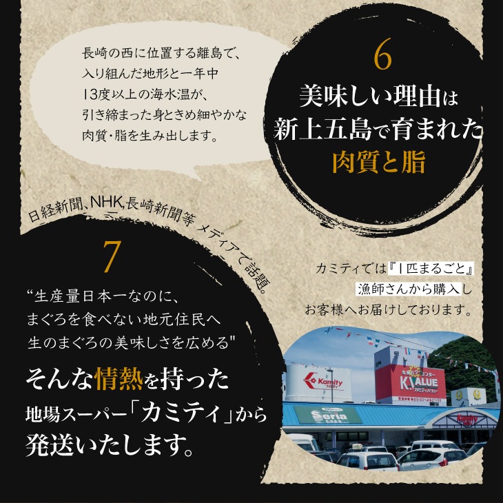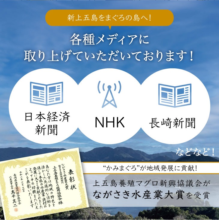 長崎県新上五島町で水揚げされた本マグロを、一度も冷凍せずにご自宅へお届けします! 稚魚から3年以上育て、新鮮なサバやアジで育成させたマグロは、60~80キロの大きさになるまで育て、水揚げ後2分以内に処理しているため鮮度抜群。 冷蔵配送のため、届いてすぐにお召し上がりすることをお勧めしますが、特殊フィルムで梱包されているため1週間冷蔵可能です。 口の中でとろける鮮度と旨味が自慢で、自社の飲食店でも大人気! ながさき水産業大賞も受賞しています。 一度食べたらリピートが絶えない、飲食店やお客様から高い評価をいただいている「かみまぐろ」をぜひ一度ご賞味ください! |