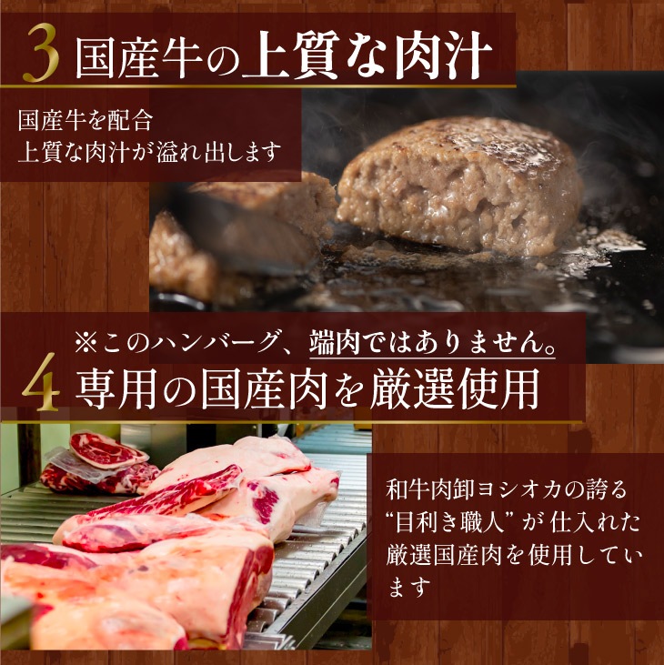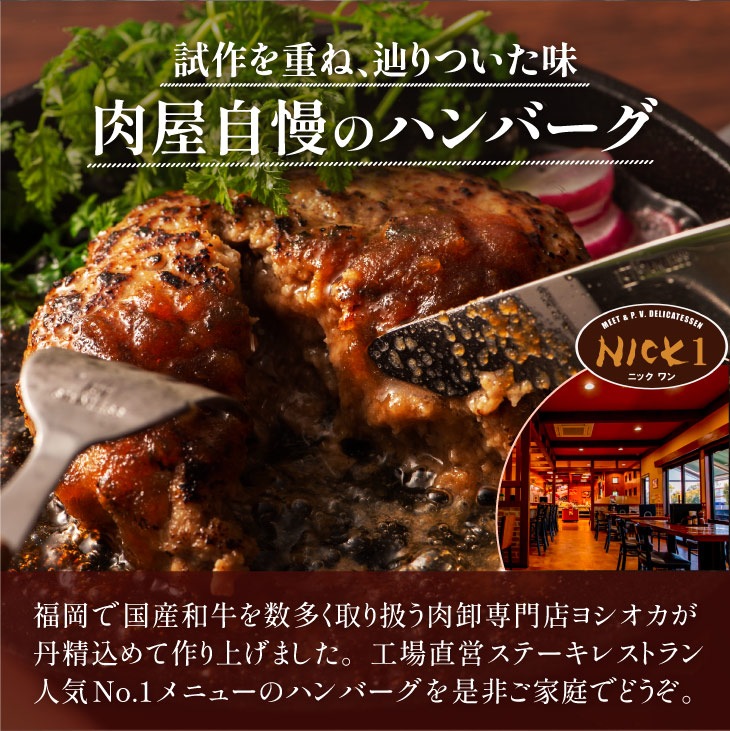 国産牛の旨みに国産豚をプラス。牛100%だと固く焼けてしまうため、あえて牛と豚の合い挽きにしています。 程よい柔らかさ、そして鹿児島知覧町でこだわりの飼料で育ったたまごを使った、 肉屋直営レストラン「Nick1」でも大好評の味をそのままに。 福岡・久留米のレストラン「Nick1」の味、ご家庭でもどうぞ。 イベント限定としてオリジナルスリーブが対応可能です。※選択肢よりお選びください |