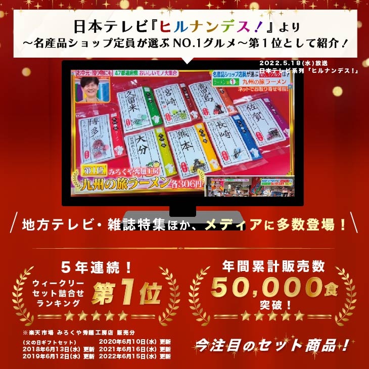 あの「ヒルナンデス」でも紹介された、"九州の旅ラーメンシリーズ"の中でも人気の地域を厳選しセットにしました。