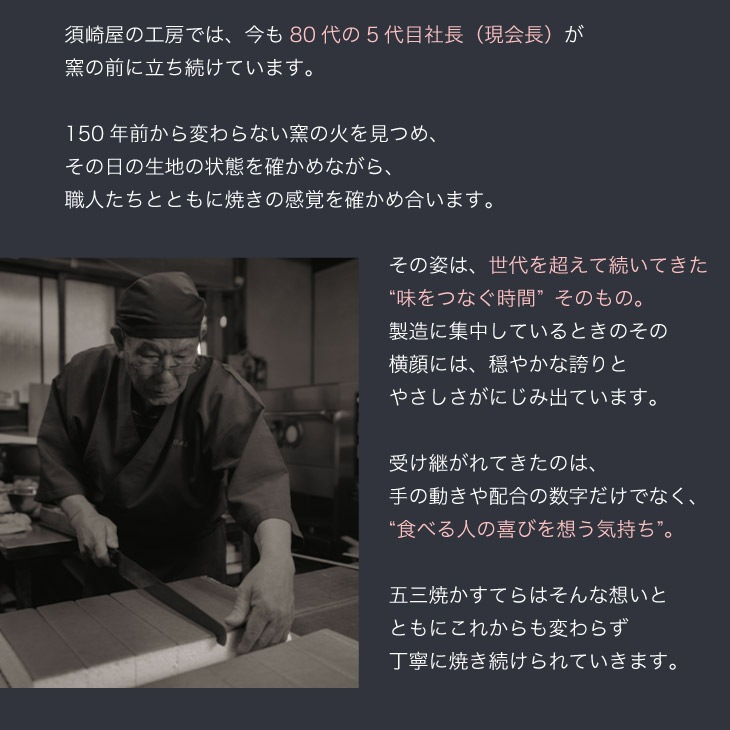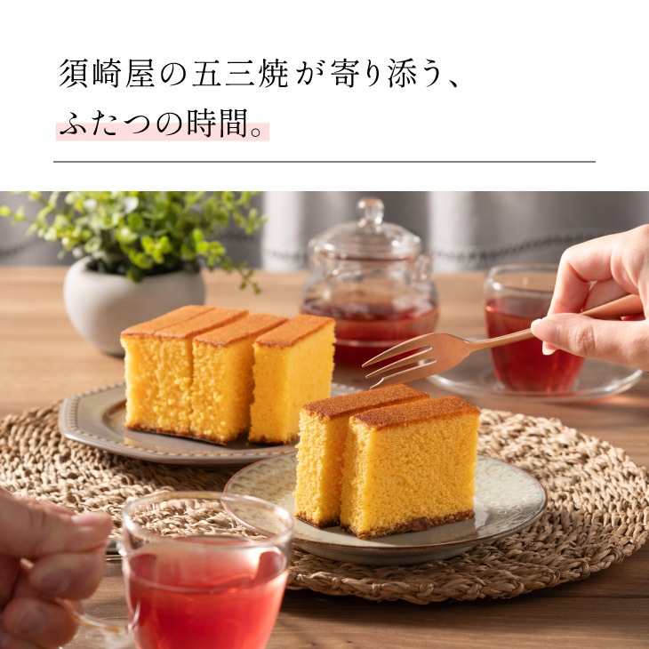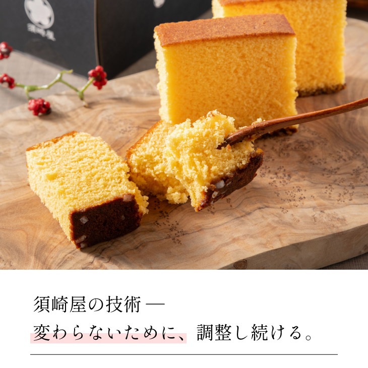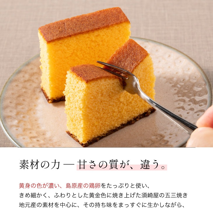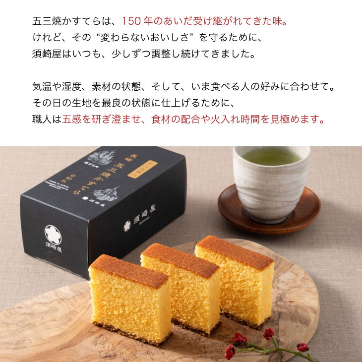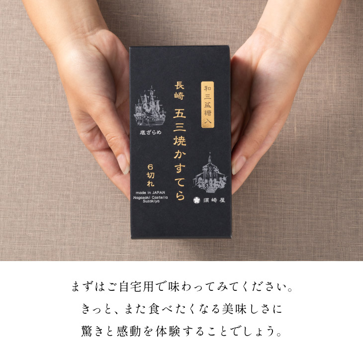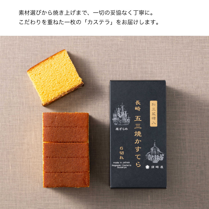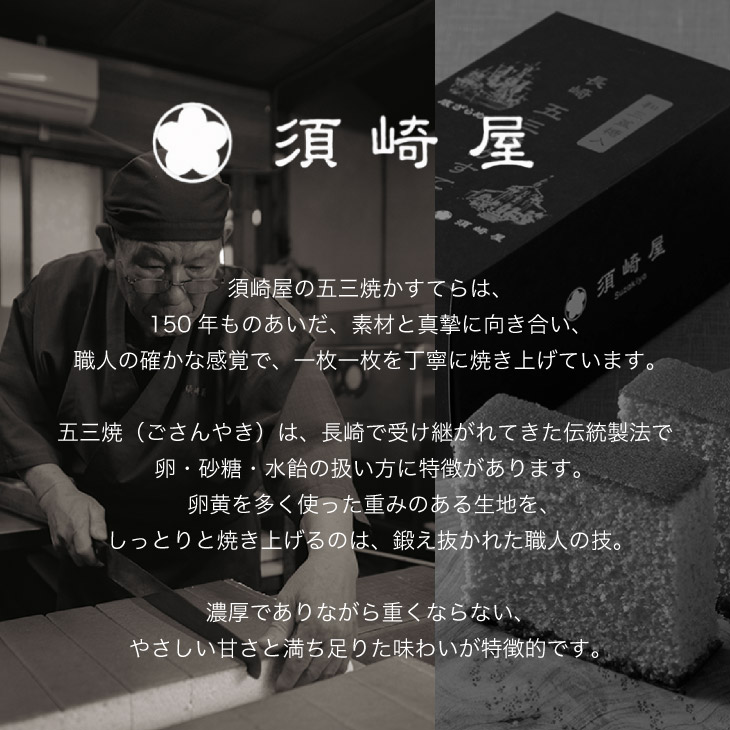 創業慶応3年、須崎屋がこだわり抜いた製法で1枚1枚丁寧に焼き上げた五三焼カステラです。 五代目の伊藤代二が三代目のレシピを元に、現代に蘇らせた須崎屋の五三焼は、地元長崎県産のブランド卵、佐賀県産の高級米飴、阿波産の和三盆糖などこだわりの原料と、職人が丁寧に泡切りを行い、その日の気温や湿度に合った焼き方を調整しております。 日本橋長崎館でも売上No1の須崎屋の五三焼かすてらをご賞味くださいませ。 |