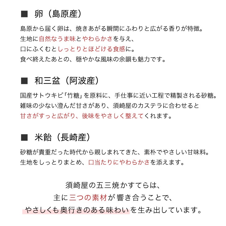 鶏卵(長崎県島原半島産)、上白糖、小麦粉、もち米水飴、グラニュー糖、和三盆糖、ざらめ糖、(一部に卵・小麦を含む) ※本商品は、乳成分を含む商品と一部同じ工程で作られています。 |