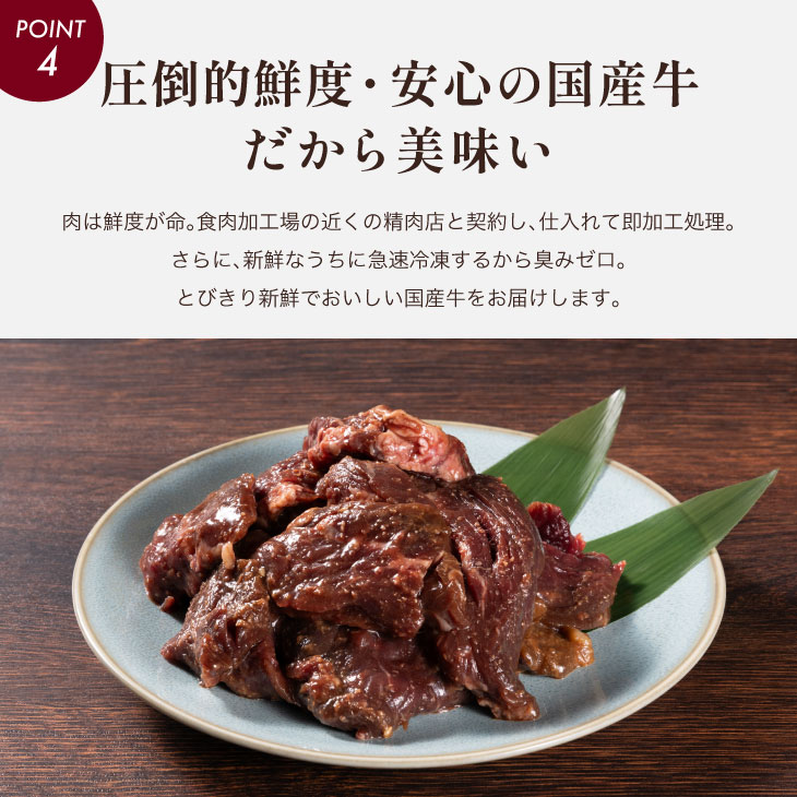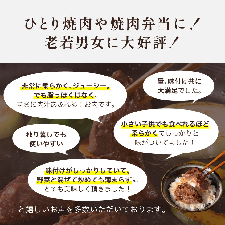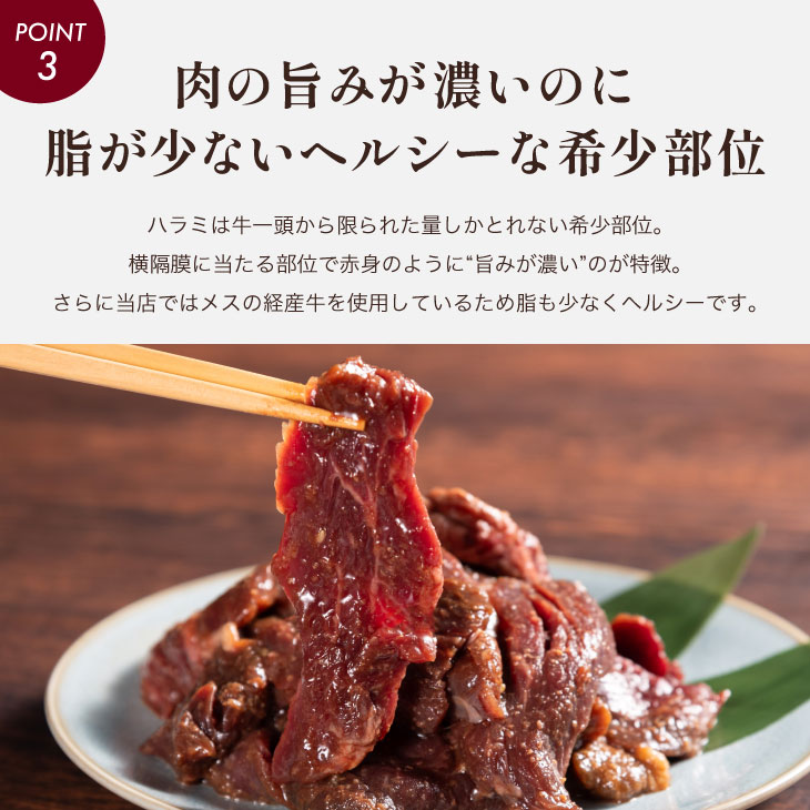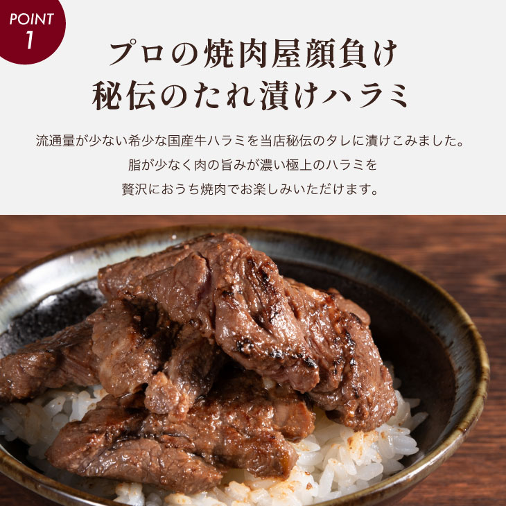 | 九州産の当店秘伝のタレに漬けたぷりぷりの国産牛ハラミです。そのまま焼くのはもちろん、野菜と一緒に炒めても味が薄まることなく美味しくいただけます。 |