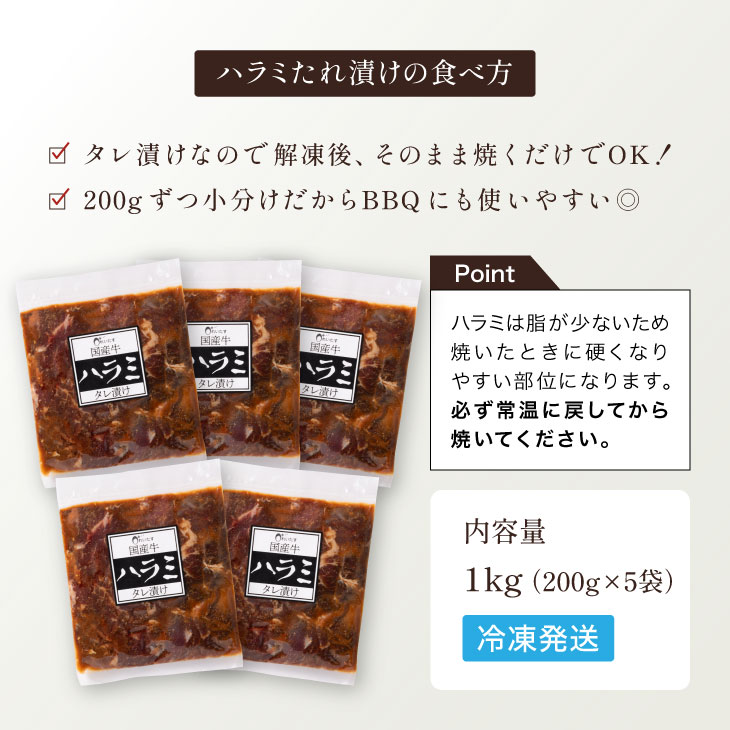 産地直送「国産牛ハラミ タレ漬け 1kg(200g×5袋)」たれ漬け ハラミ 希少部位 雌牛 九州醤油 味噌 大容量 お得 冷凍 福岡 送料無料
